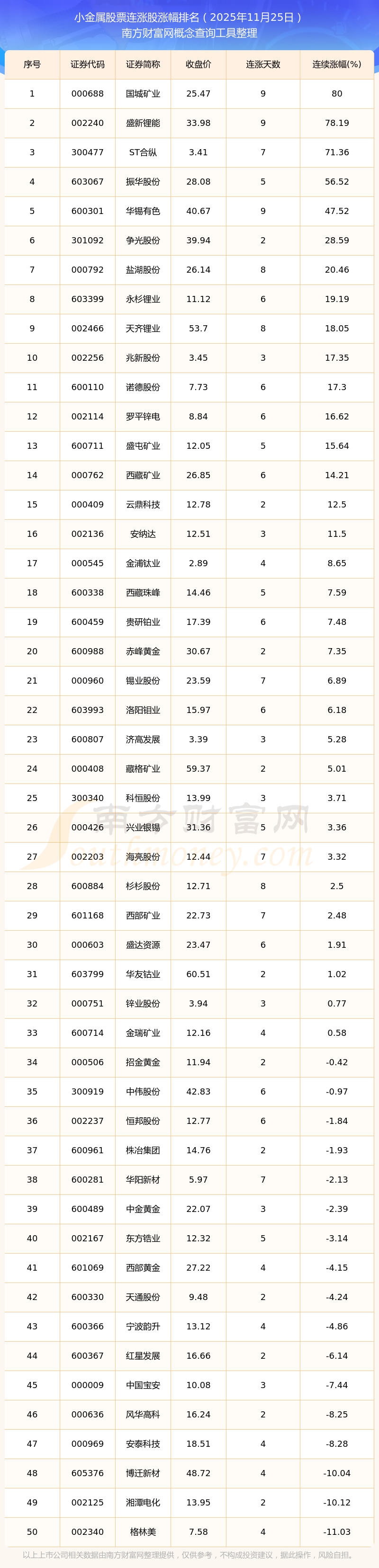 根據(jù)南方財(cái)富網(wǎng)概念查詢工具數(shù)據(jù)統(tǒng)計(jì),截止2025年11月25日收盤(pán),小金屬股票共有51只個(gè)股實(shí)現(xiàn)連漲。其中連續(xù)漲幅較大的個(gè)股有國(guó)城礦業(yè)、盛新鋰能、ST合縱等,連續(xù)漲幅分別為80.00%、78.19%、71.36%。