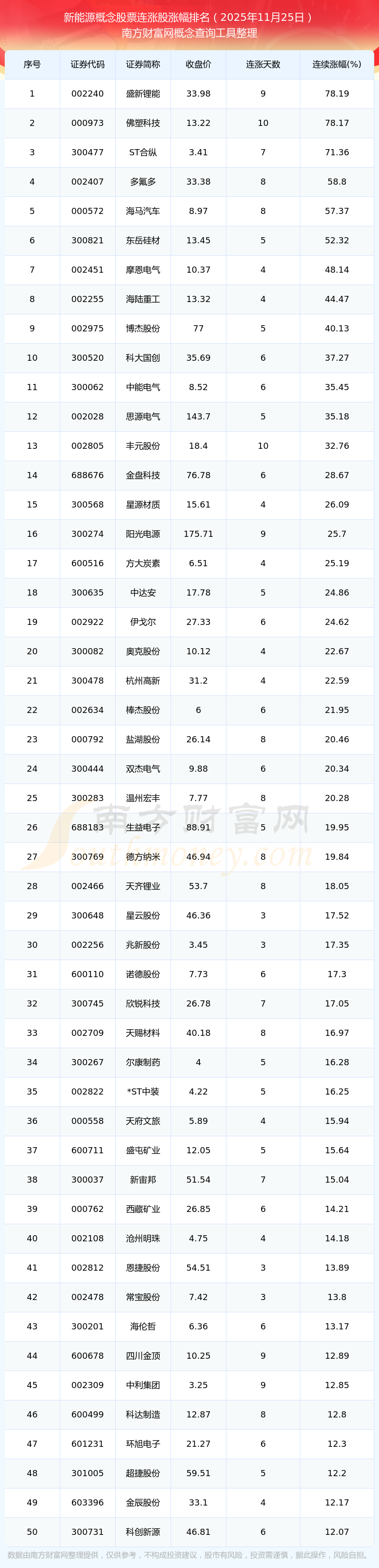 根據(jù)南方財富網(wǎng)概念查詢工具數(shù)據(jù)統(tǒng)計,截止2025年11月25日收盤,新能源概念股票共有142只個股實現(xiàn)連漲。其中連續(xù)漲幅較大的個股有盛新鋰能、佛塑科技、ST合縱等,連續(xù)漲幅分別為78.19%、78.17%、71.36%。