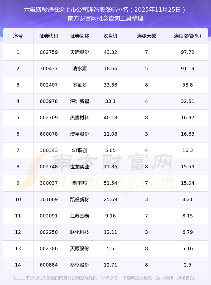 2025年11月25日六氟磷酸鋰概念上市公司連漲股漲幅排名