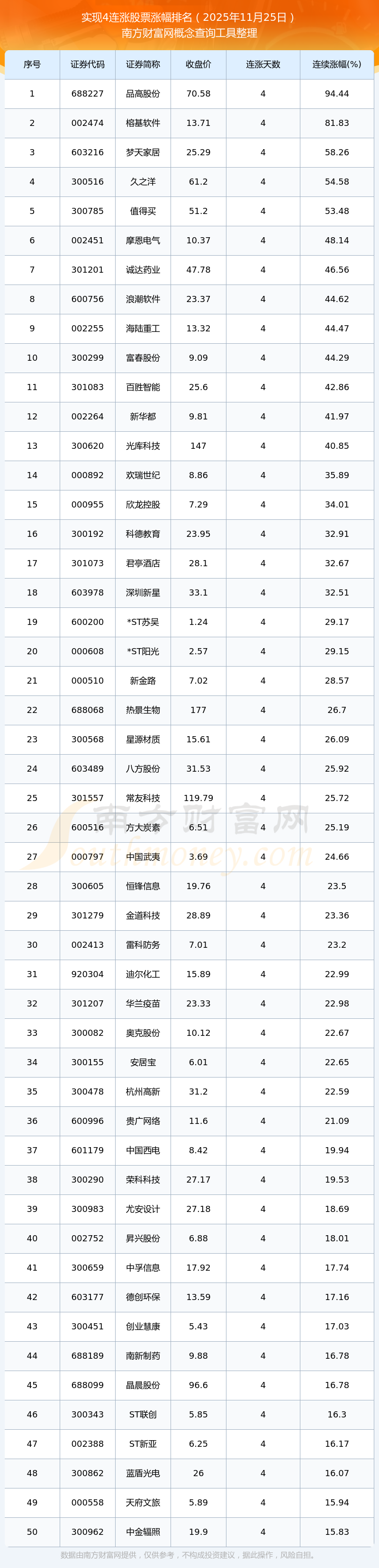 2025年11月25日實(shí)現(xiàn)4連漲股票漲幅排名