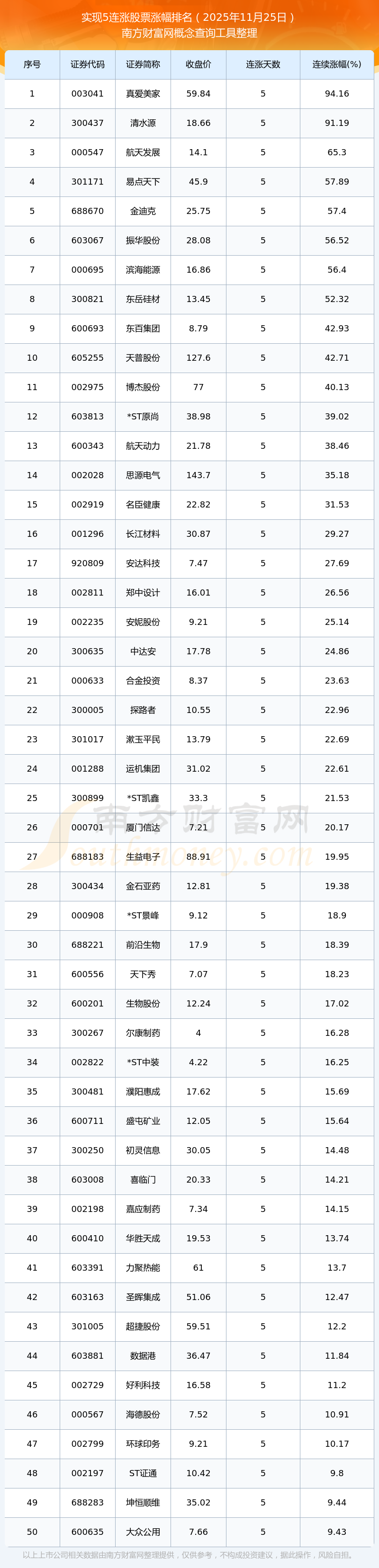 2025年11月25日實(shí)現(xiàn)5連漲股票漲幅排名