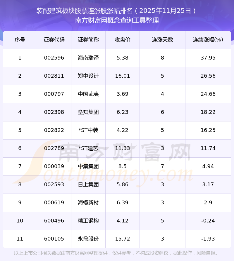 2025年11月25日裝配建筑板塊股票連漲股票漲幅排名