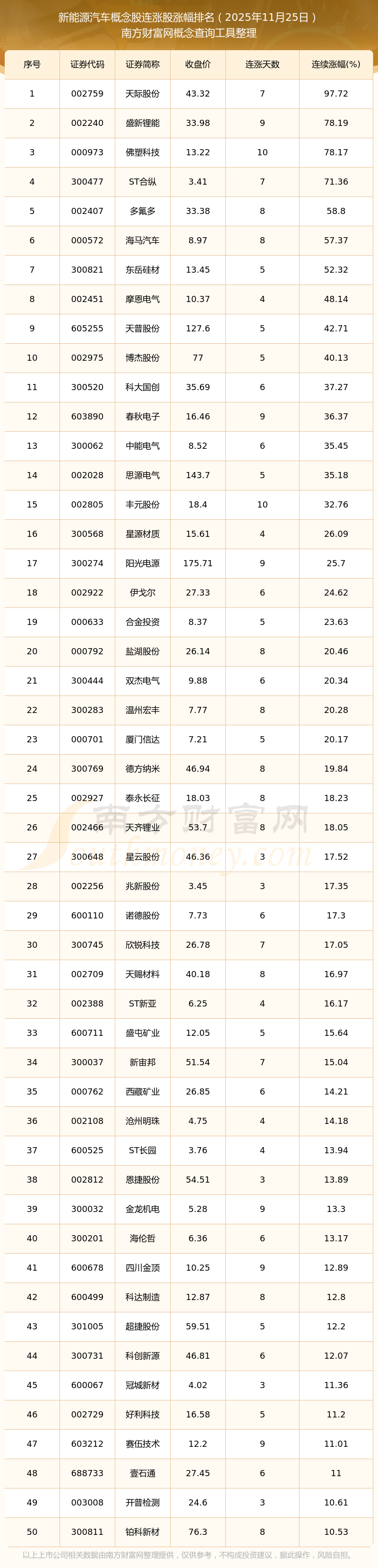 2025年11月25日新能源汽車概念股連漲股漲幅排名