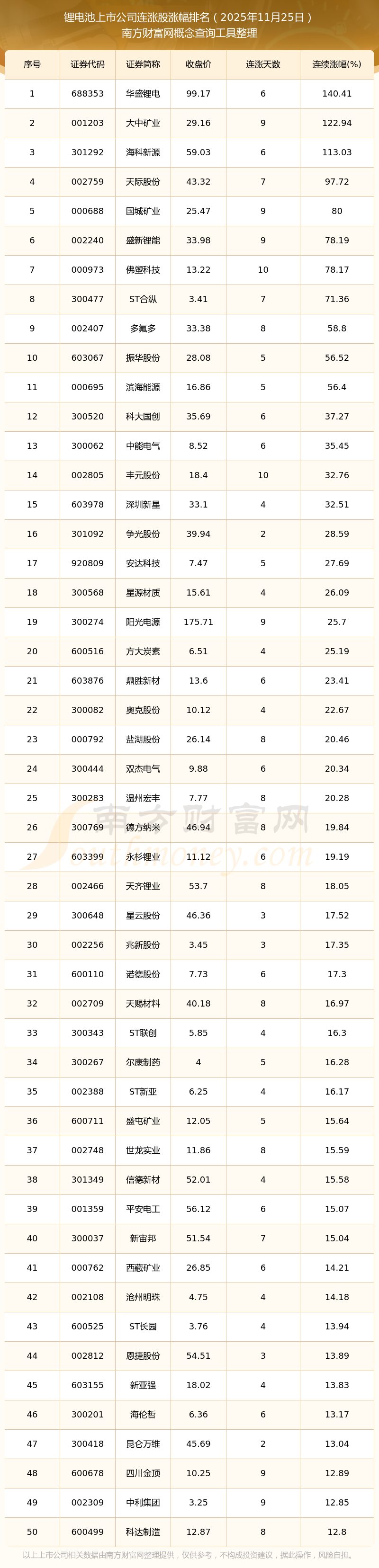 根據(jù)南方財富網(wǎng)概念查詢工具數(shù)據(jù)統(tǒng)計,截止2025年11月25日收盤,鋰電池上市公司共有138只個股實現(xiàn)連漲。其中連續(xù)漲幅較大的個股有華盛鋰電、大中礦業(yè)、?菩略吹龋B續(xù)漲幅分別為140.41%、122.94%、113.03%。