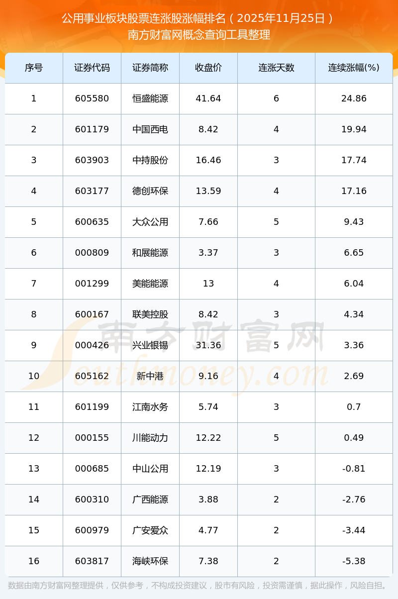 2025年11月25日公用事業(yè)板塊股票連漲股票漲幅排名