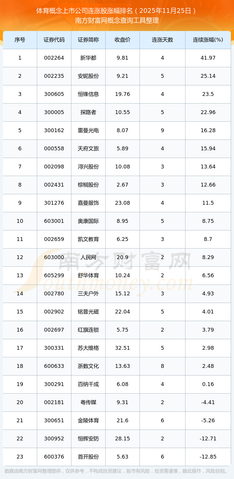 2025年11月25日體育概念上市公司連漲股漲幅排名