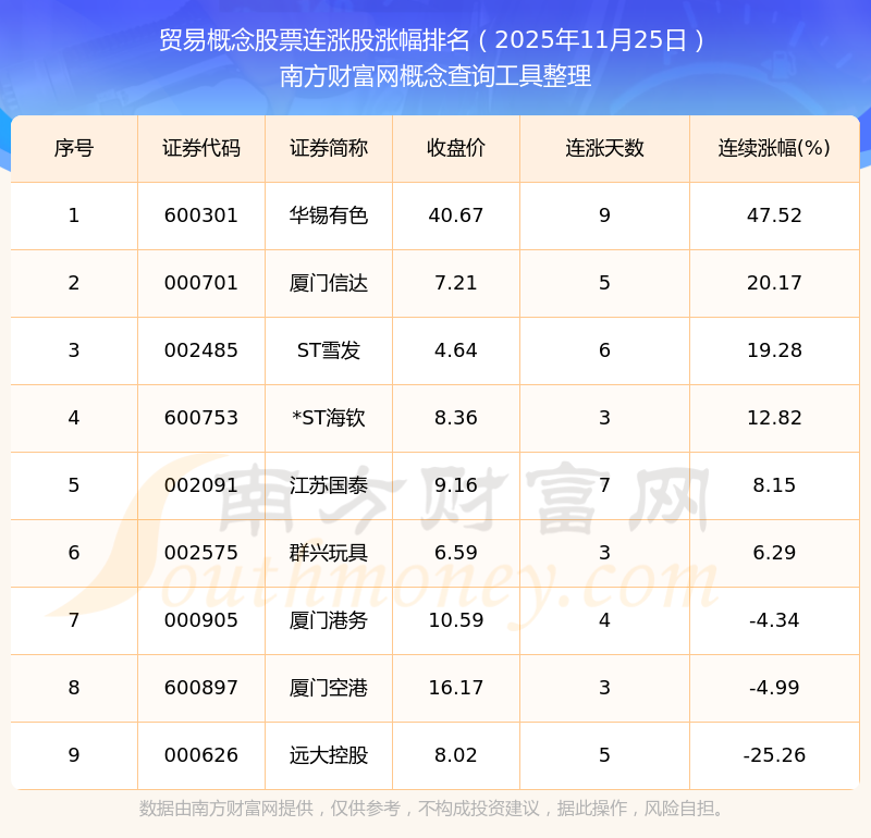 根據(jù)南方財(cái)富網(wǎng)概念查詢工具數(shù)據(jù)統(tǒng)計(jì),截止2025年11月25日收盤,貿(mào)易概念股票共有9只個(gè)股實(shí)現(xiàn)連漲。其中連續(xù)漲幅較大的個(gè)股有華錫有色、廈門信達(dá)、ST雪發(fā)等,連續(xù)漲幅分別為47.52%、20.17%、19.28%。