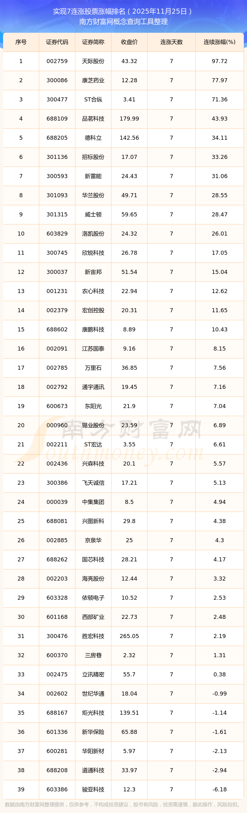 2025年11月25日股市消息:39只個股實現(xiàn)7連漲
