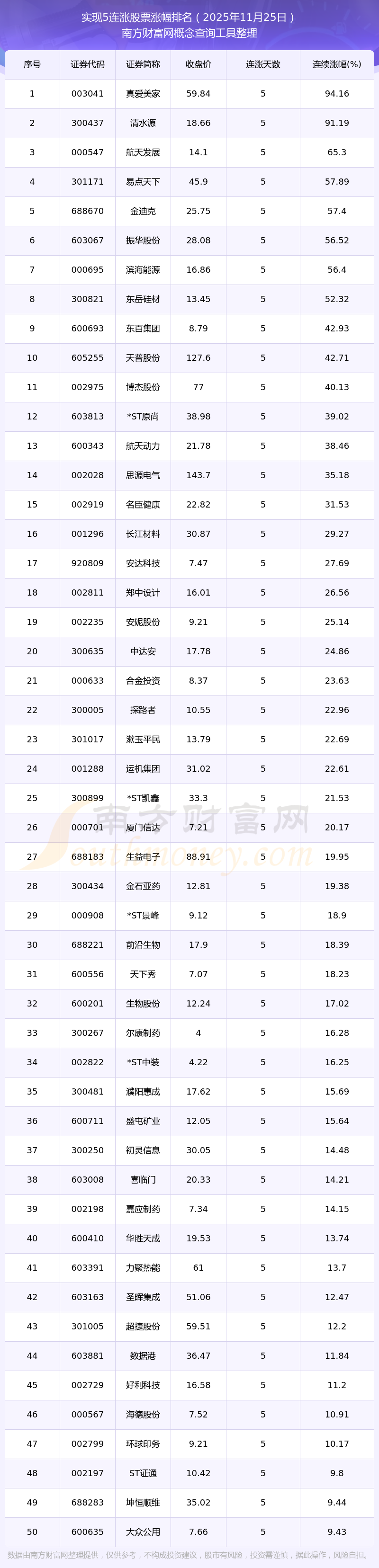 2025年11月25日實現(xiàn)5連漲股票漲幅排名