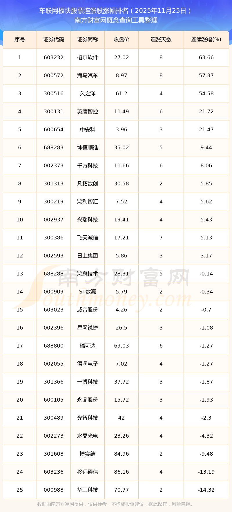 2025年11月25日車聯(lián)網(wǎng)板塊股票連漲股漲幅排名