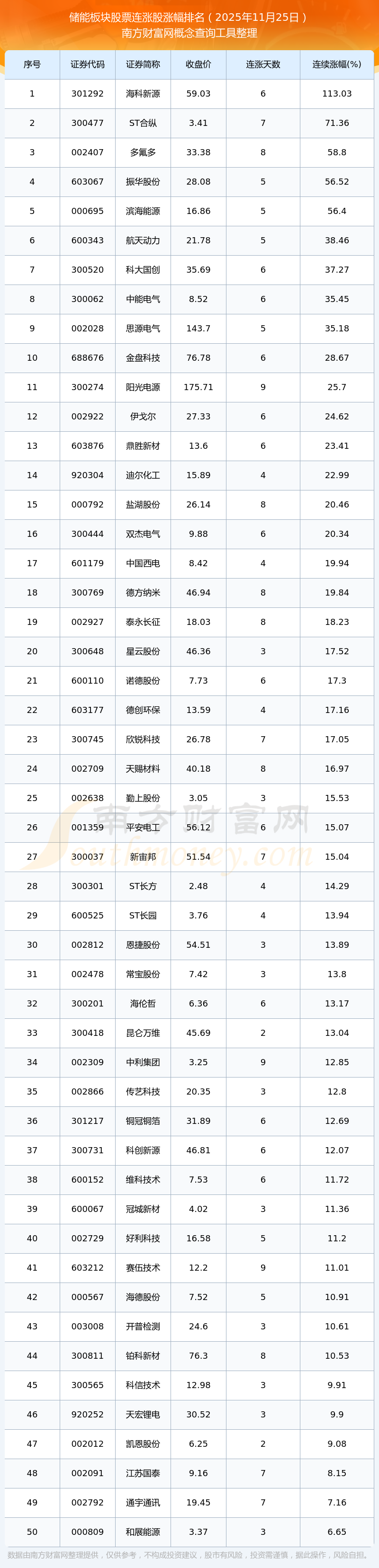 2025年11月25日儲能板塊股票連漲股漲幅排名
