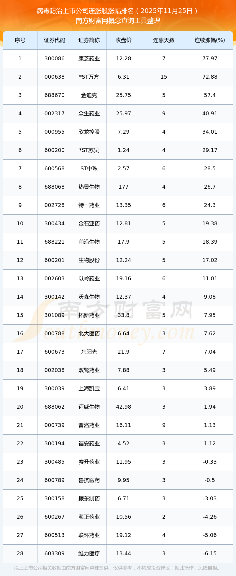 2025年11月25日病毒防治上市公司連漲股漲幅排名