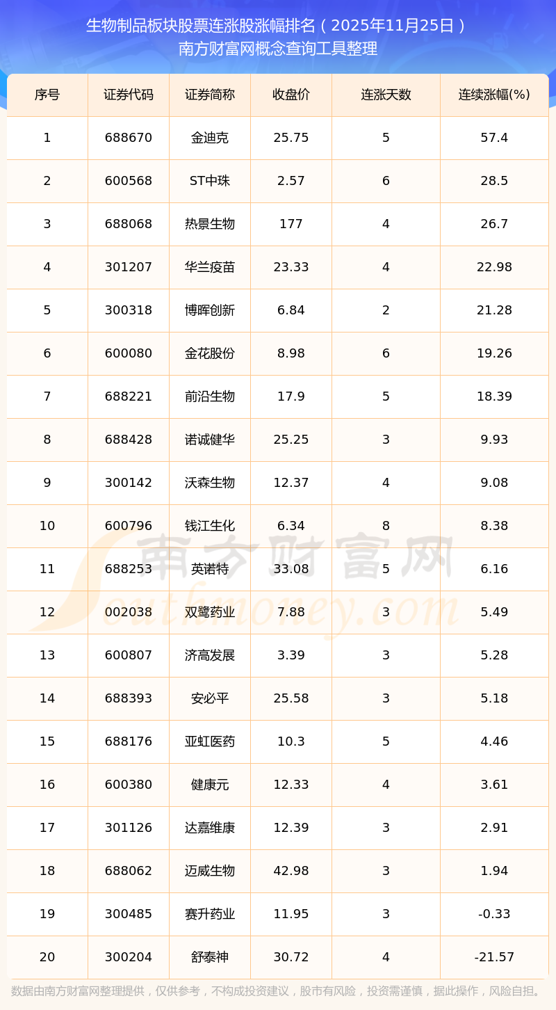 2025年11月25日生物制品板塊股票連漲股漲幅排名