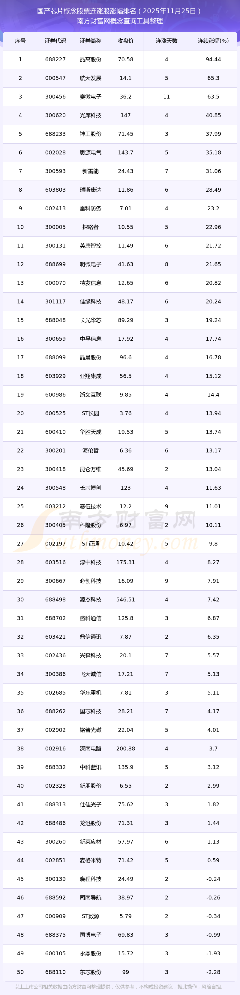 2025年11月25日國產(chǎn)芯片概念股票連漲股漲幅排名