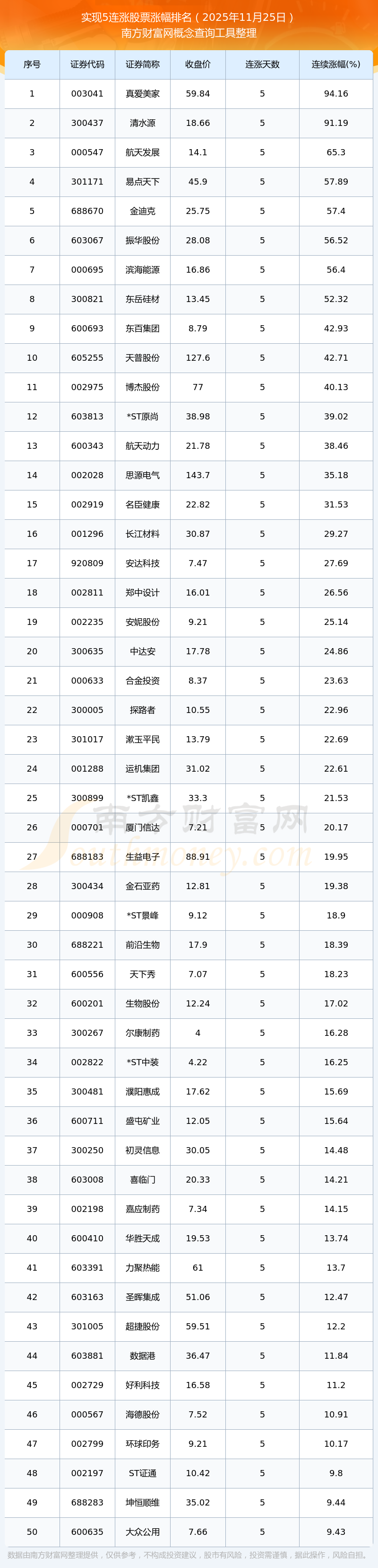 2025年11月25日實現(xiàn)5連漲股票漲幅排名