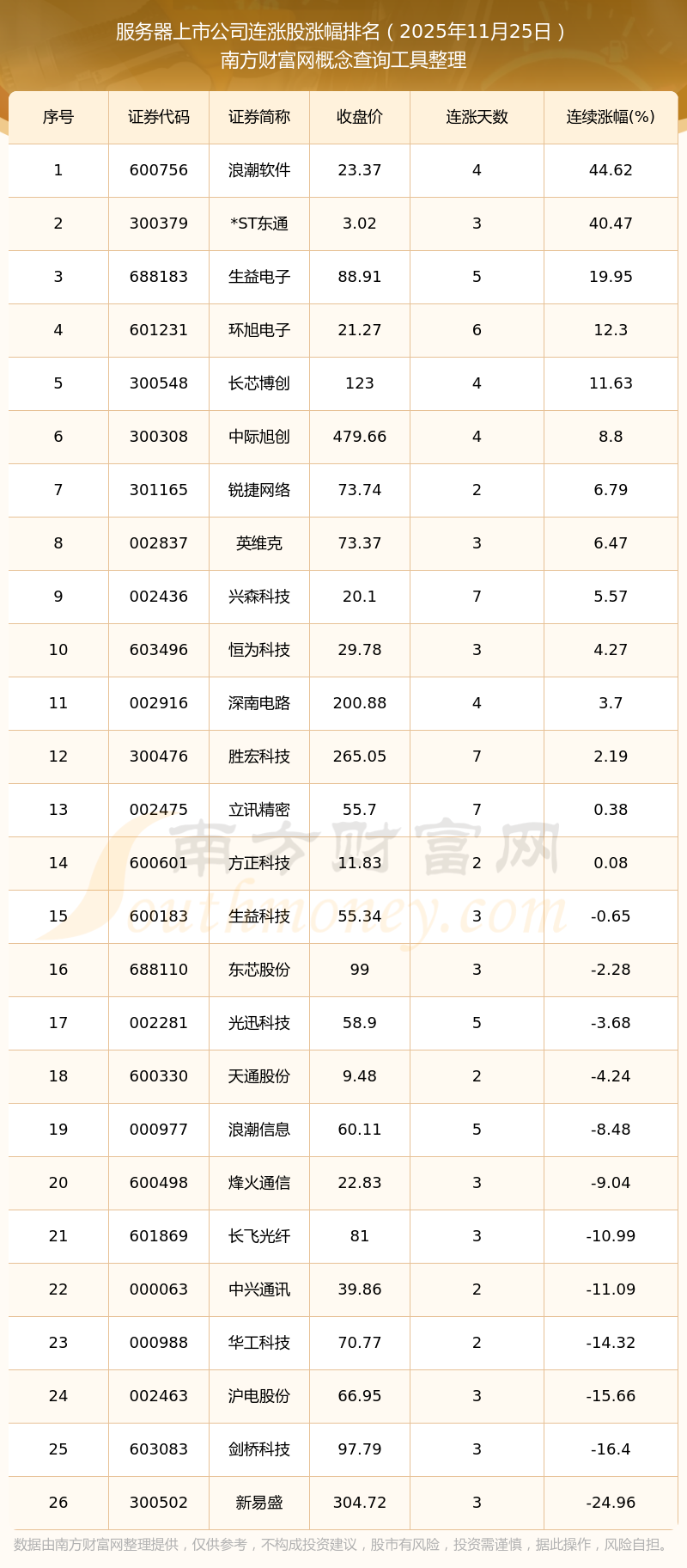 2025年11月25日服務(wù)器上市公司連漲股漲幅排名