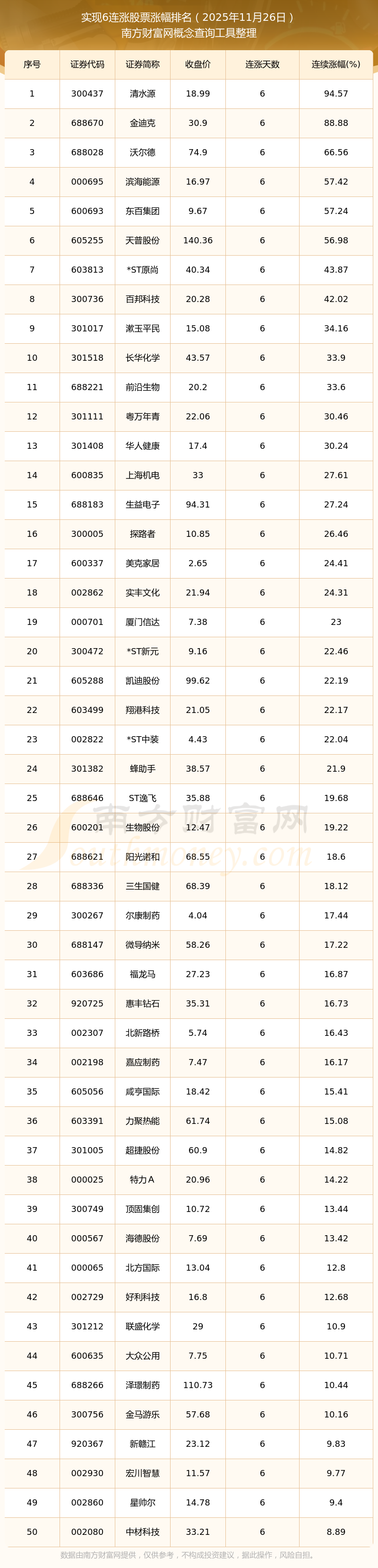 2025年11月26日實現(xiàn)6連漲股票漲幅排名