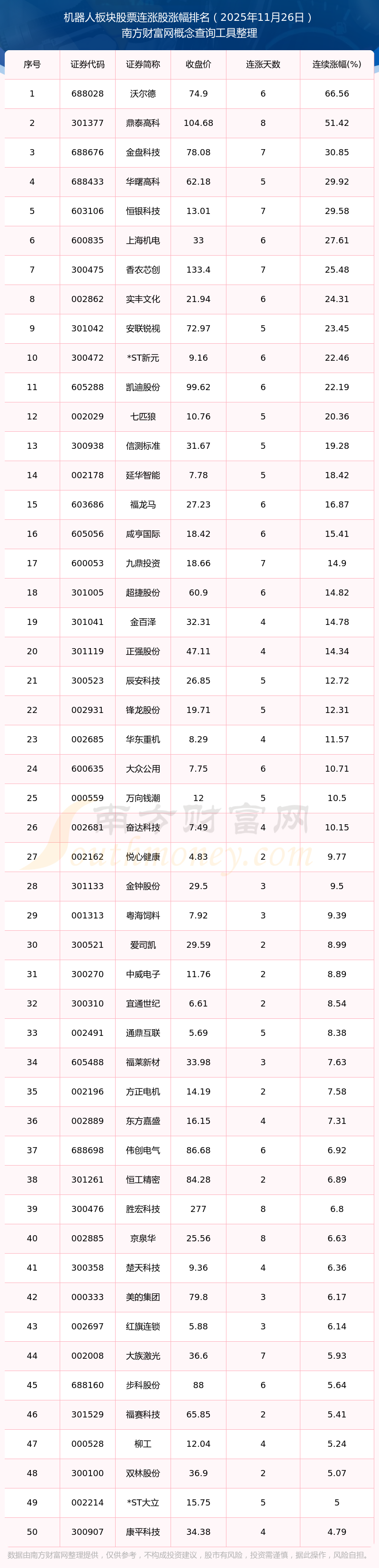 根據(jù)南方財富網(wǎng)概念查詢工具數(shù)據(jù)統(tǒng)計,截止2025年11月26日收盤,機器人板塊股票共有152只個股實現(xiàn)連漲。其中連續(xù)漲幅較大的個股有沃爾德、鼎泰高科、金盤科技等,連續(xù)漲幅分別為66.56%、51.42%、30.85%。