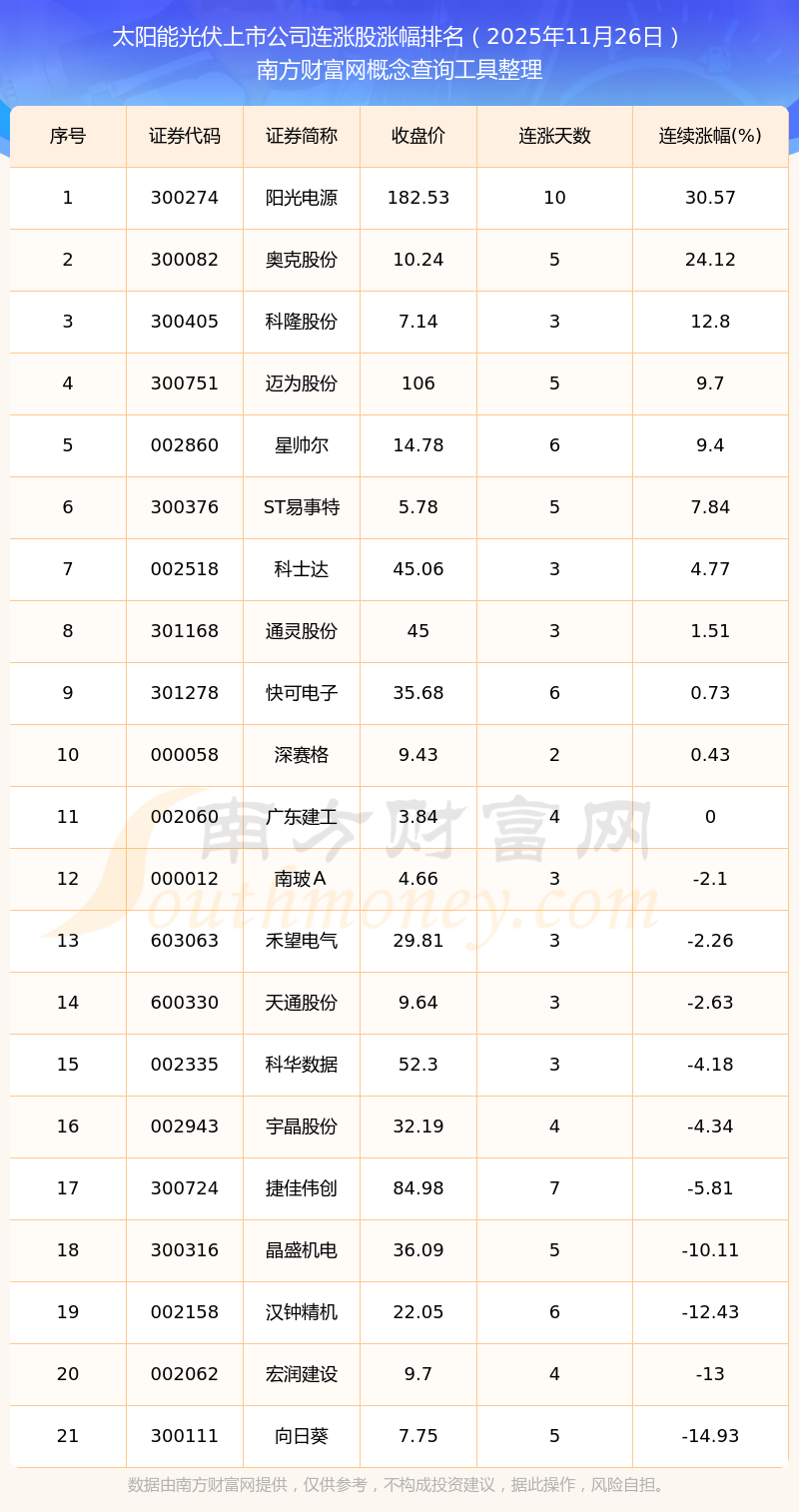 2025年11月26日太陽能光伏上市公司連漲股漲幅排名