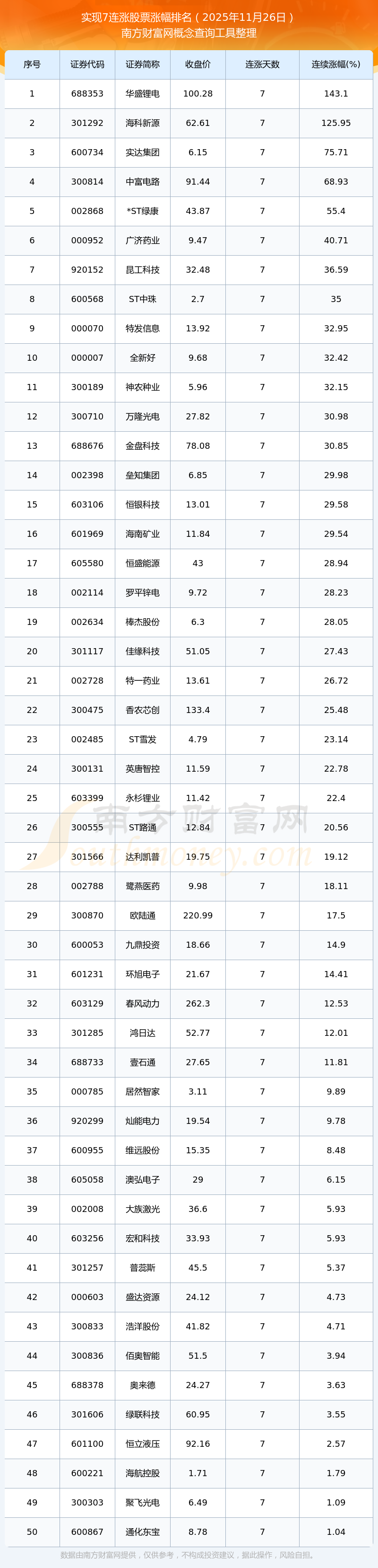 2025年11月26日實(shí)現(xiàn)7連漲股票漲幅排名