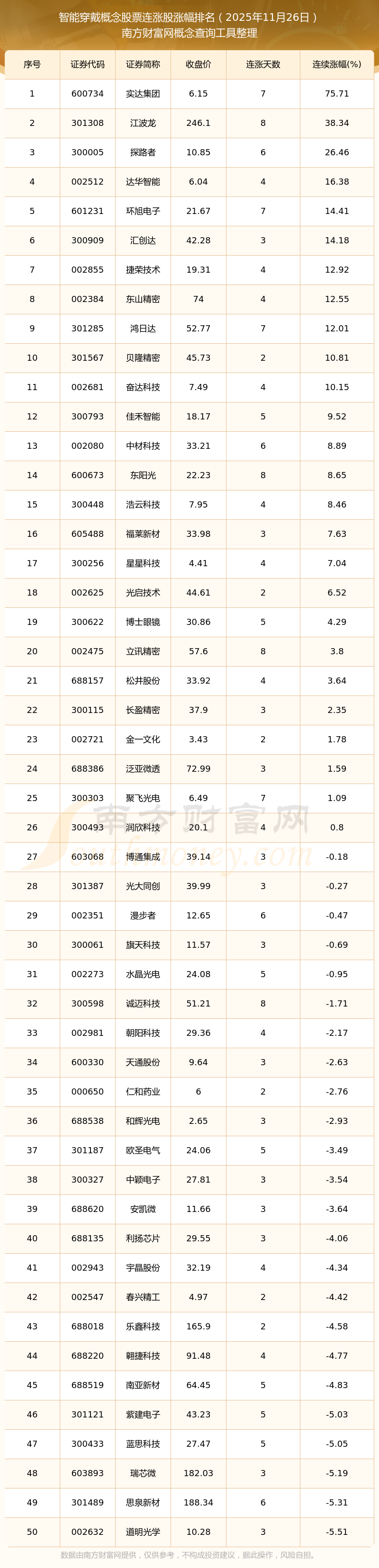 2025年11月26日智能穿戴概念股票連漲股漲幅排名