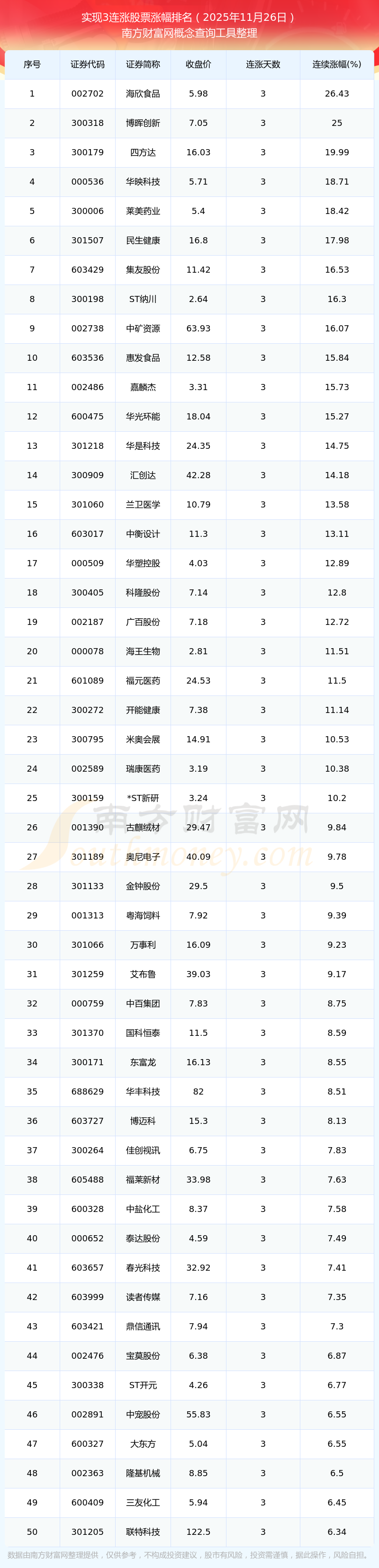 2025年11月26日實(shí)現(xiàn)3連漲股票漲幅排名