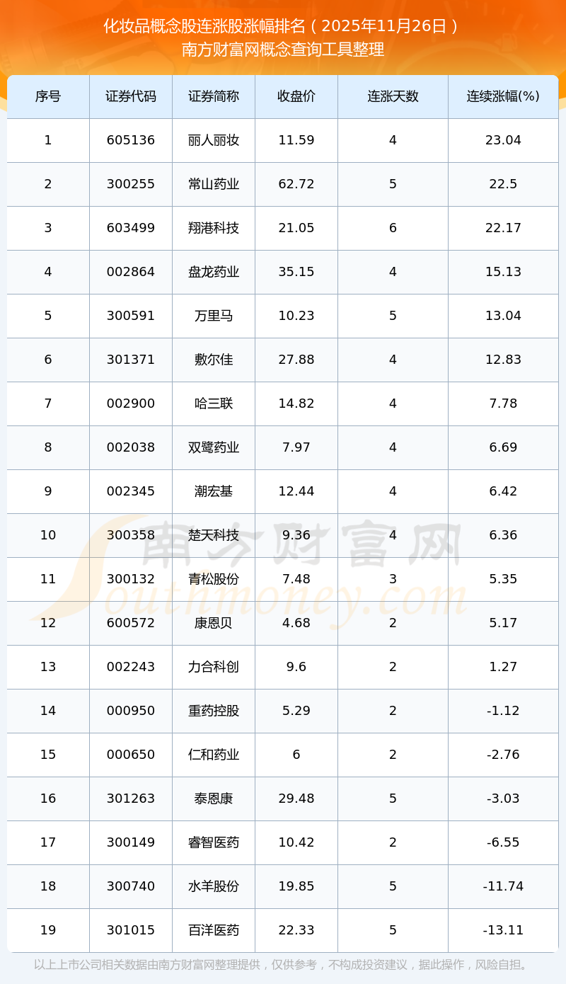 2025年11月26日化妝品概念股連漲股漲幅排名
