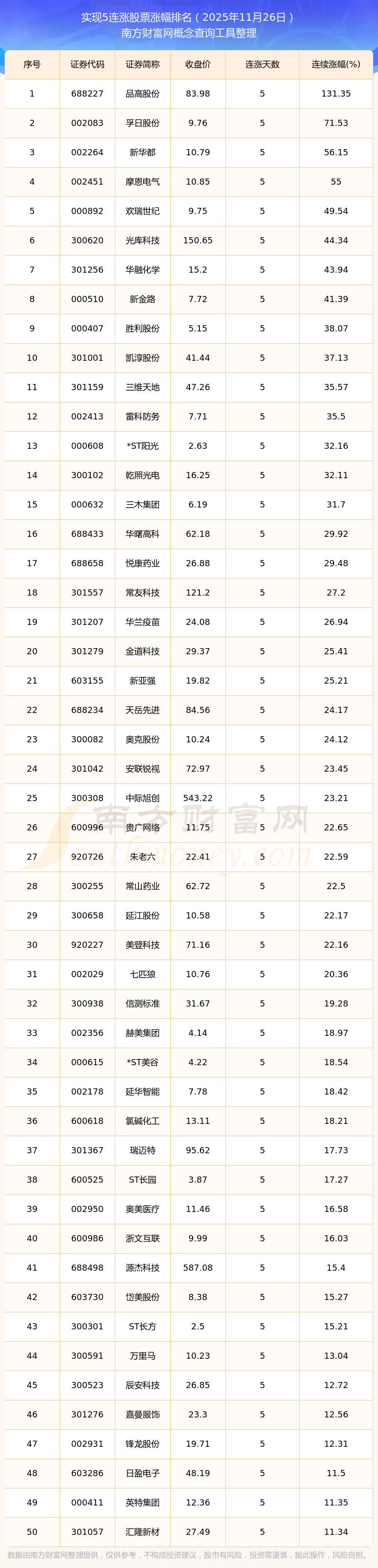 2025年11月26日實(shí)現(xiàn)5連漲股票漲幅排名