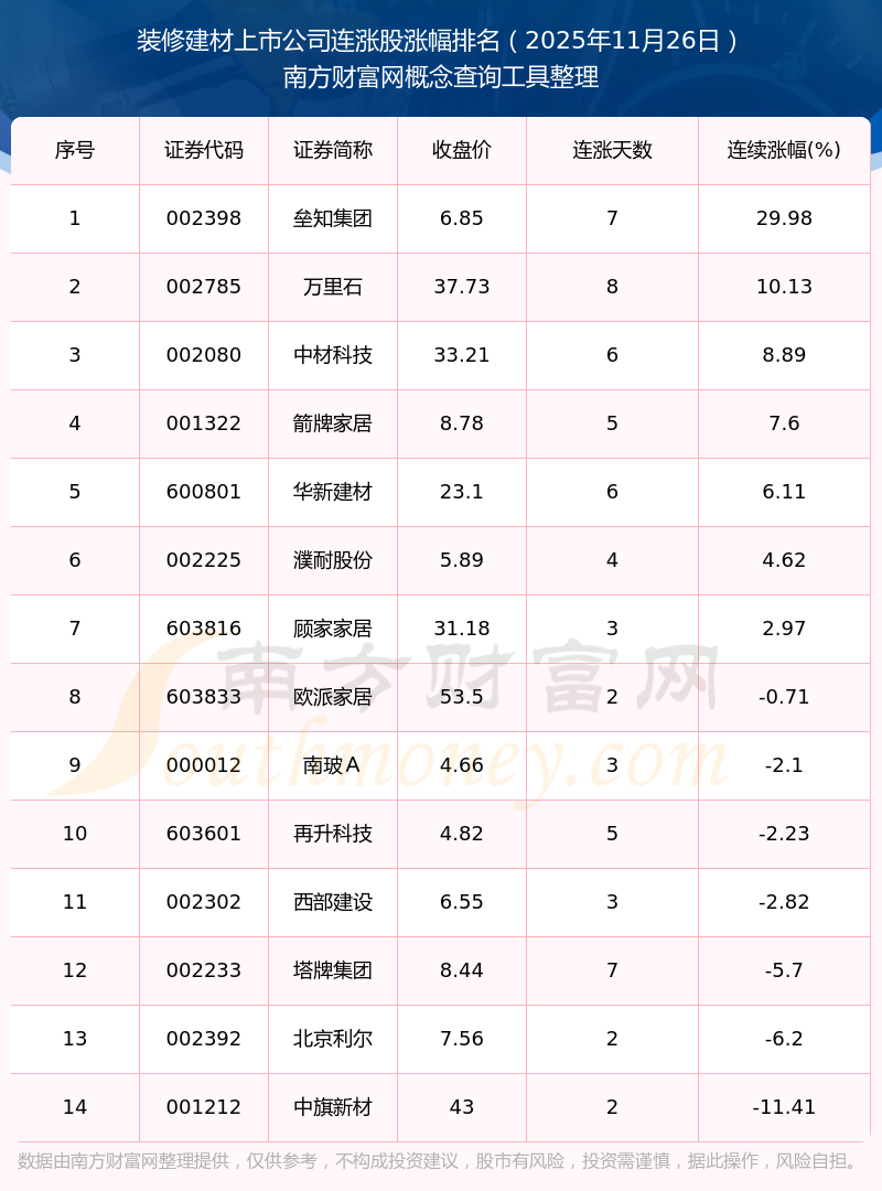 根據(jù)南方財富網(wǎng)概念查詢工具數(shù)據(jù)統(tǒng)計,截止2025年11月26日收盤,裝修建材上市公司共有14只個股實現(xiàn)連漲。其中連續(xù)漲幅較大的個股有壘知集團、萬里石、中材科技等,連續(xù)漲幅分別為29.98%、10.13%、8.89%。