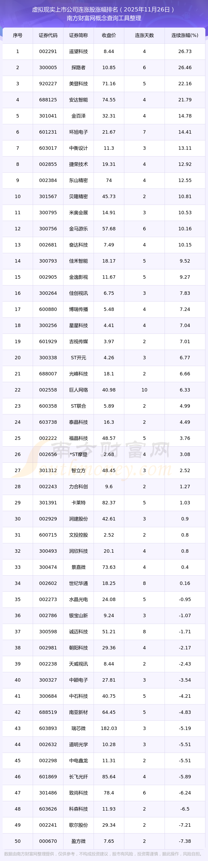2025年11月26日虛擬現(xiàn)實上市公司連漲股漲幅排名