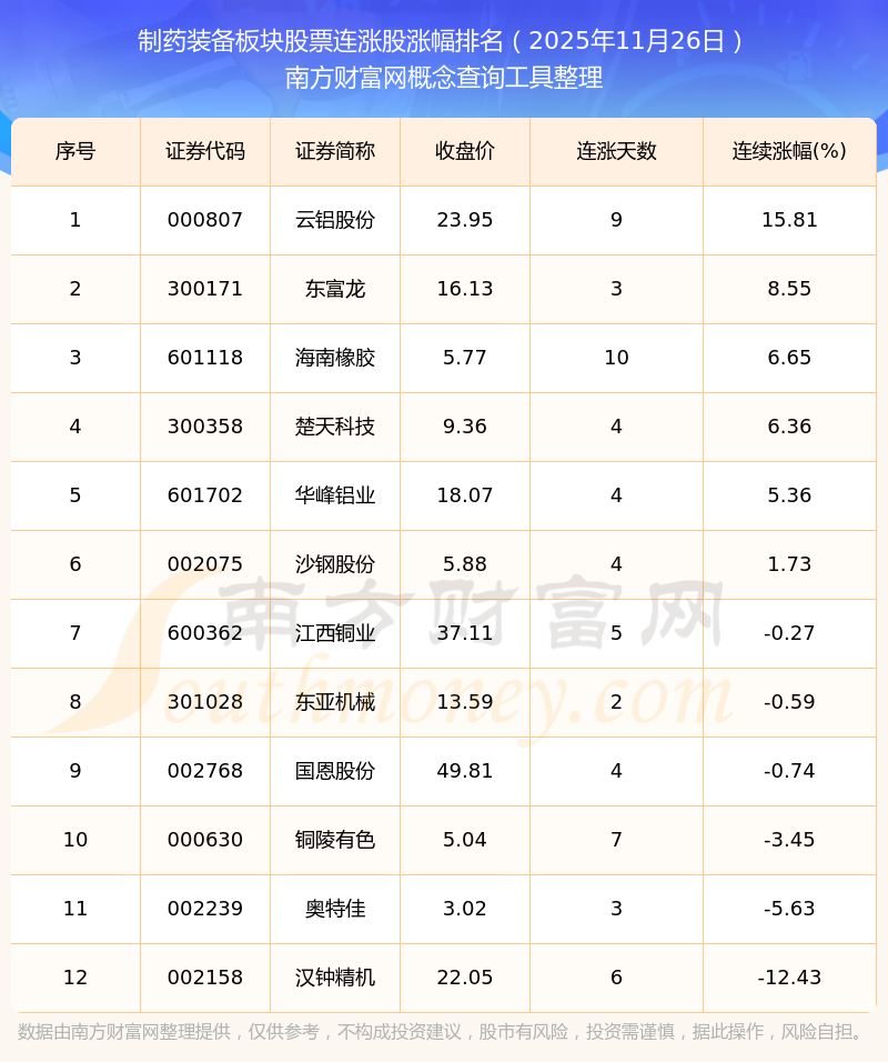 根據(jù)南方財富網(wǎng)概念查詢工具數(shù)據(jù)統(tǒng)計,截止2025年11月26日收盤,制藥裝備板塊股票共有12只個股實現(xiàn)連漲。其中連續(xù)漲幅較大的個股有云鋁股份、東富龍、海南橡膠等,連續(xù)漲幅分別為15.81%、8.55%、6.65%。