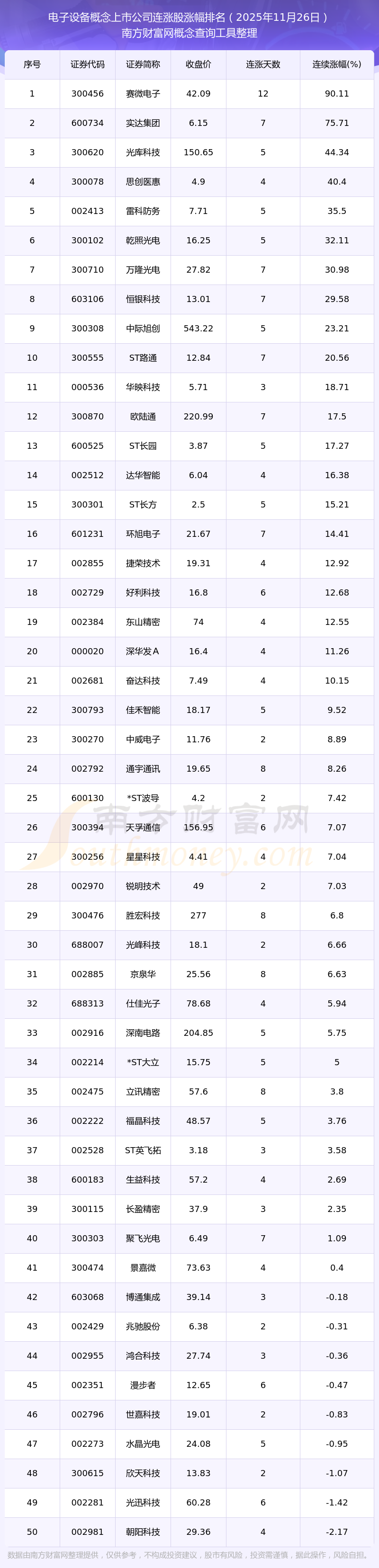 2025年11月26日電子設(shè)備概念上市公司連漲股漲幅排名