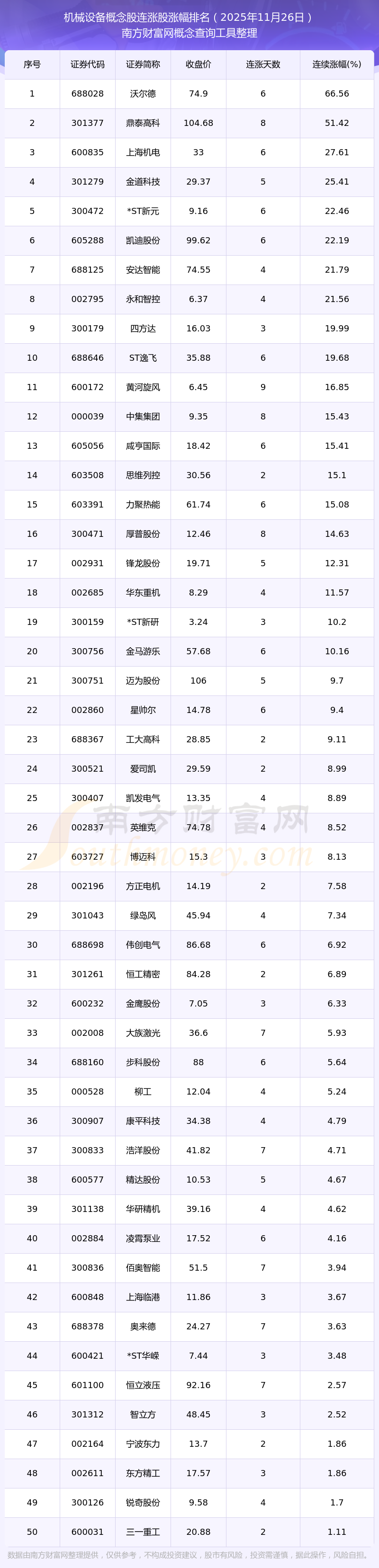 2025年11月26日機械設備概念股連漲股漲幅排名