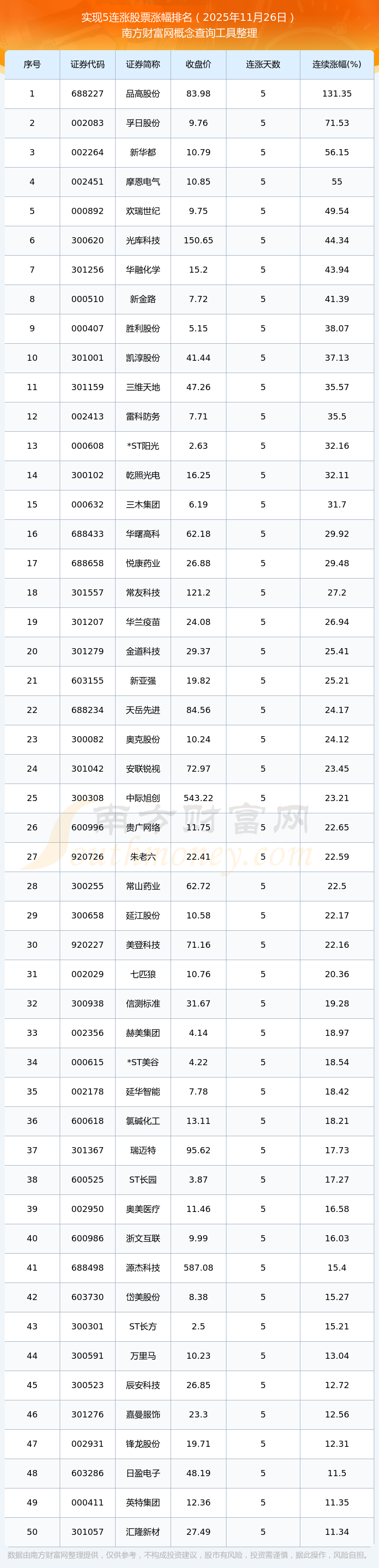 2025年11月26日實(shí)現(xiàn)5連漲股票漲幅排名