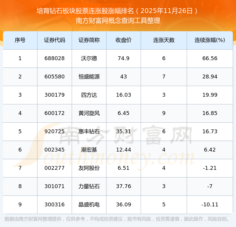 根據(jù)南方財(cái)富網(wǎng)概念查詢工具數(shù)據(jù)統(tǒng)計(jì),截止2025年11月26日收盤,培育鉆石板塊股票共有9只個(gè)股實(shí)現(xiàn)連漲。其中連續(xù)漲幅較大的個(gè)股有沃爾德、恒盛能源、四方達(dá)等,連續(xù)漲幅分別為66.56%、28.94%、19.99%。