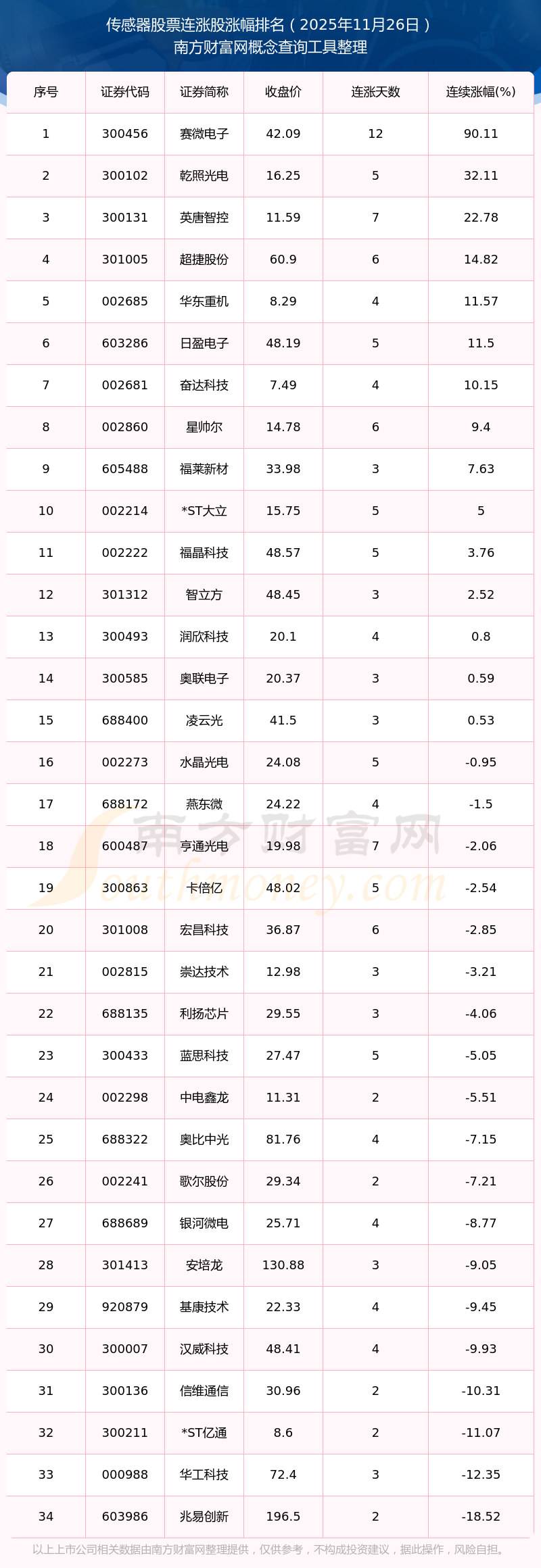 根據(jù)南方財(cái)富網(wǎng)概念查詢工具數(shù)據(jù)統(tǒng)計(jì),截止2025年11月26日收盤,傳感器股票共有34只個股實(shí)現(xiàn)連漲。其中連續(xù)漲幅較大的個股有賽微電子、乾照光電、英唐智控等,連續(xù)漲幅分別為90.11%、32.11%、22.78%。