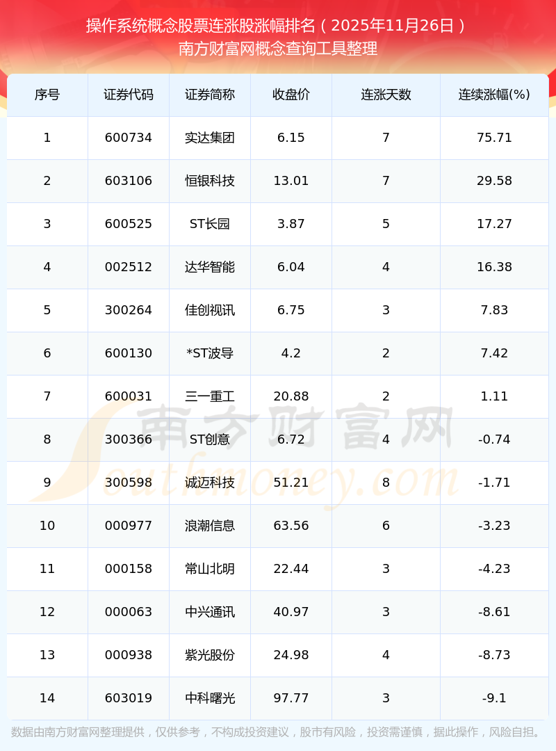 2025年11月26日操作系統(tǒng)概念股票連漲股漲幅排名