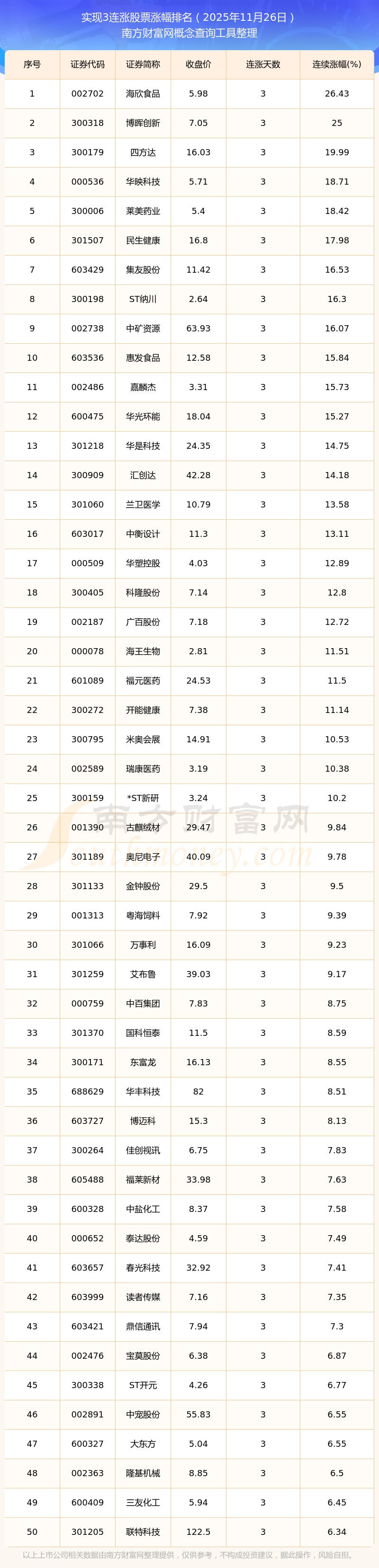 2025年11月26日實(shí)現(xiàn)3連漲股票漲幅排名