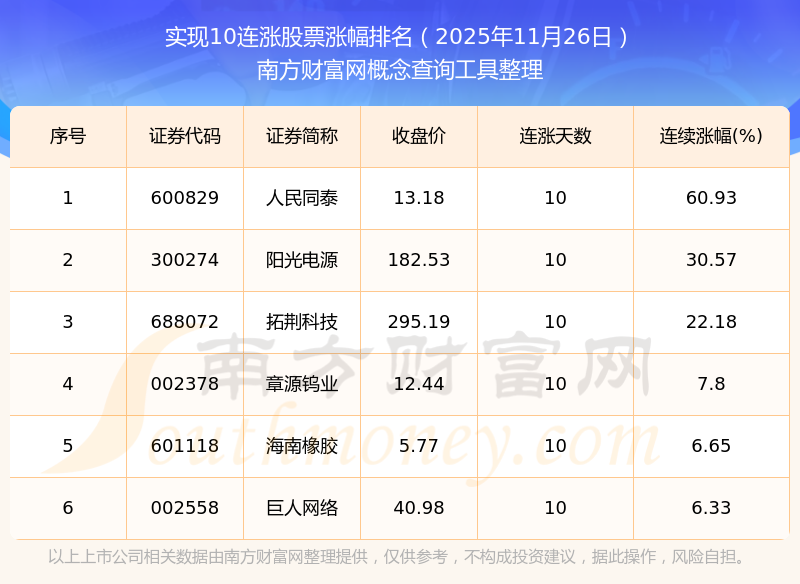 根據(jù)南方財富網(wǎng)概念查詢工具數(shù)據(jù)統(tǒng)計,截止2025年11月26日收盤,共有6只個股實現(xiàn)10天連漲。其中連續(xù)漲幅較大的個股有人民同泰、陽光電源、拓荊科技等,連續(xù)漲幅分別為60.93%、30.57%、22.18%。