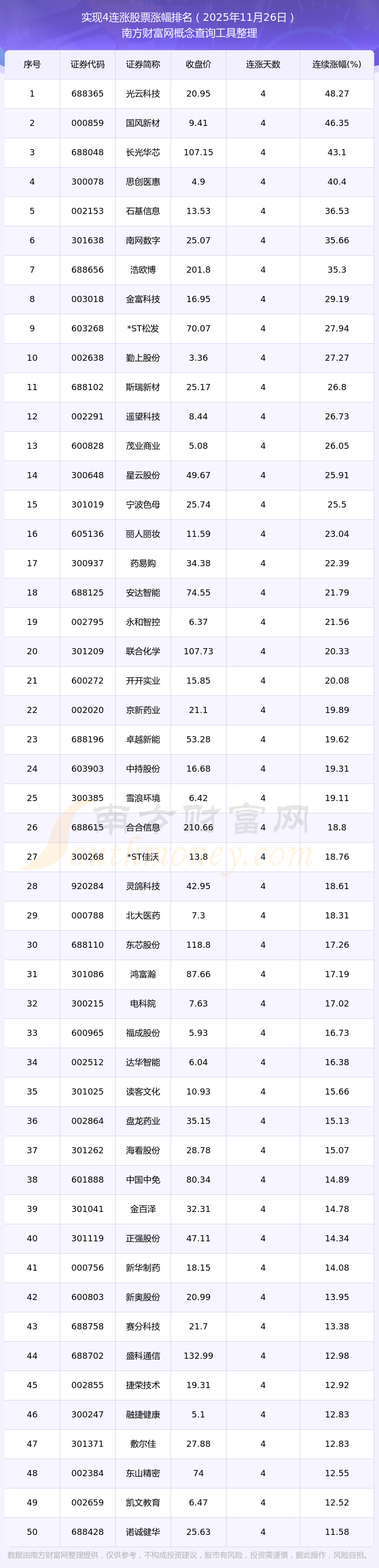 2025年11月26日實現(xiàn)4連漲股票漲幅排名