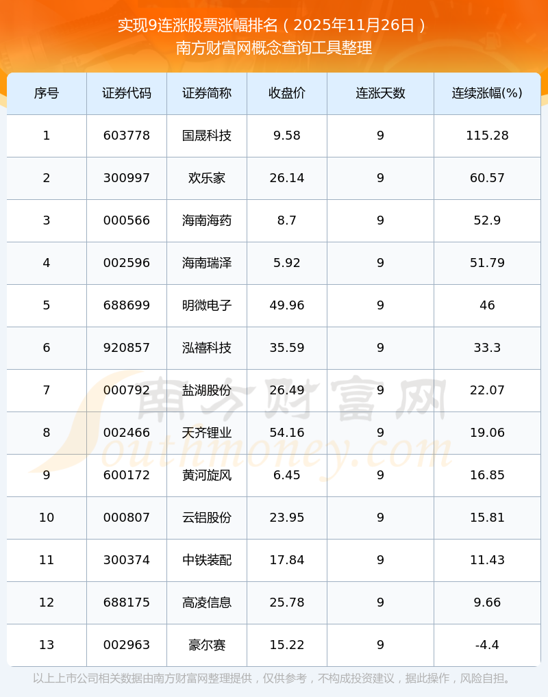 根據(jù)南方財富網(wǎng)概念查詢工具數(shù)據(jù)統(tǒng)計,截止2025年11月26日收盤,共有13只個股實現(xiàn)9天連漲。其中連續(xù)漲幅較大的個股有國晟科技、歡樂家、海南海藥等,連續(xù)漲幅分別為115.28%、60.57%、52.90%。