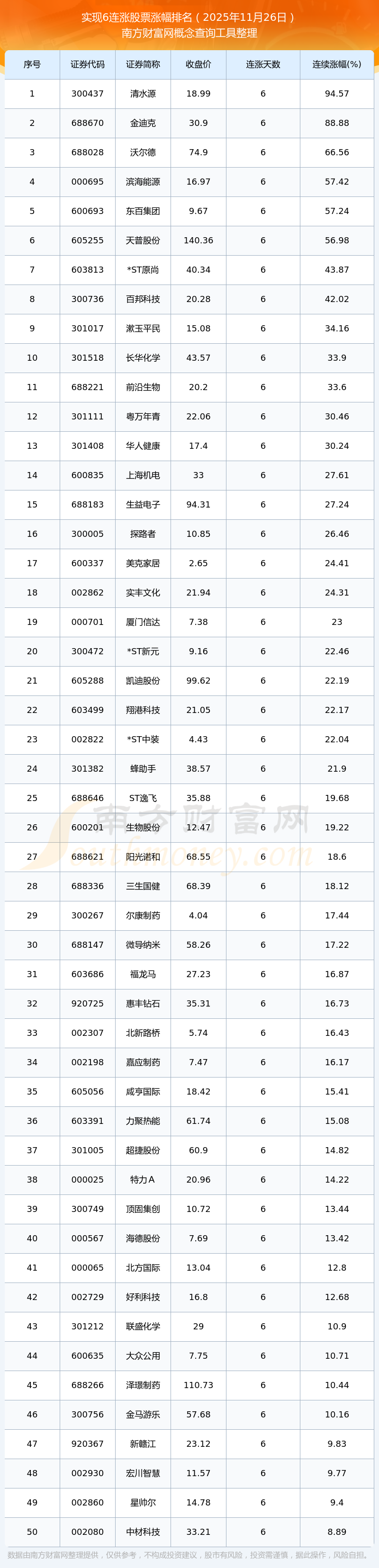 根據(jù)南方財富網(wǎng)概念查詢工具數(shù)據(jù)統(tǒng)計,截止2025年11月26日收盤,共有100只個股實現(xiàn)6天連漲。其中連續(xù)漲幅較大的個股有清水源、金迪克、沃爾德等,連續(xù)漲幅分別為94.57%、88.88%、66.56%。
