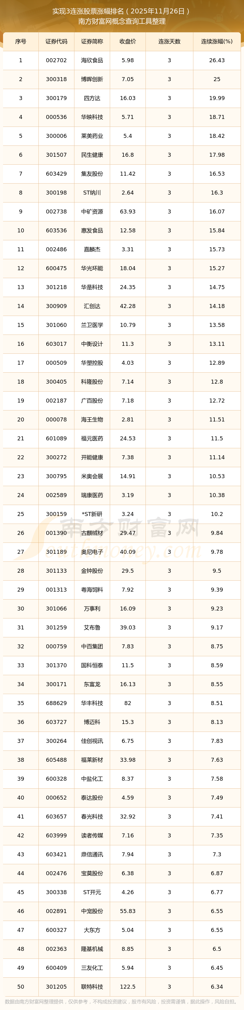 2025年11月26日實現(xiàn)3連漲股票漲幅排名