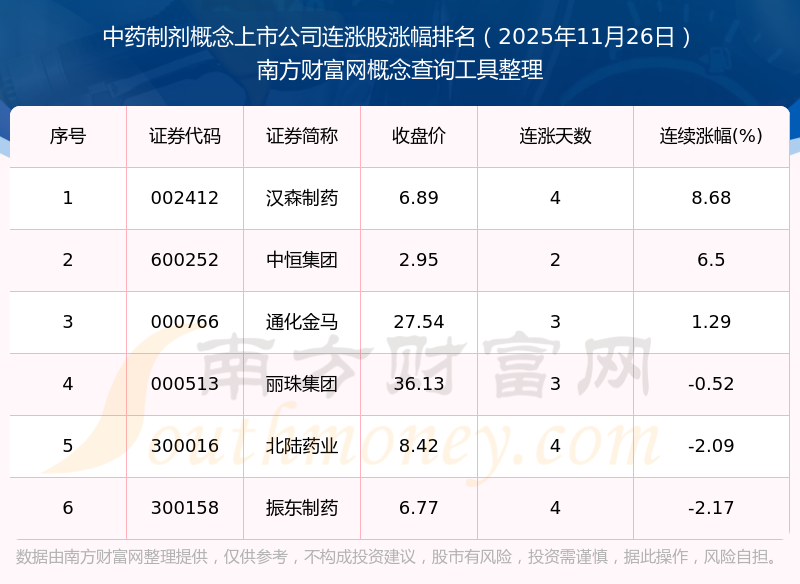 2025年11月26日中藥制劑概念上市公司連漲股票漲幅排名