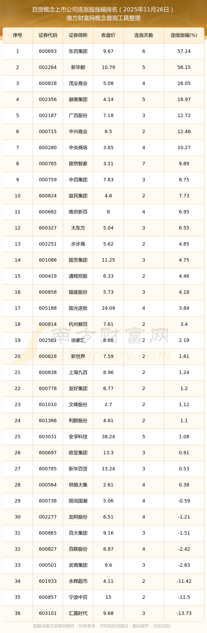 2025年11月26日百貨概念上市公司連漲股漲幅排名