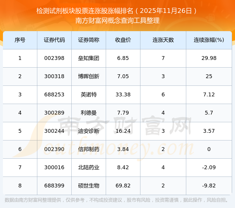 2025年11月26日檢測(cè)試劑板塊股票連漲股漲幅排名