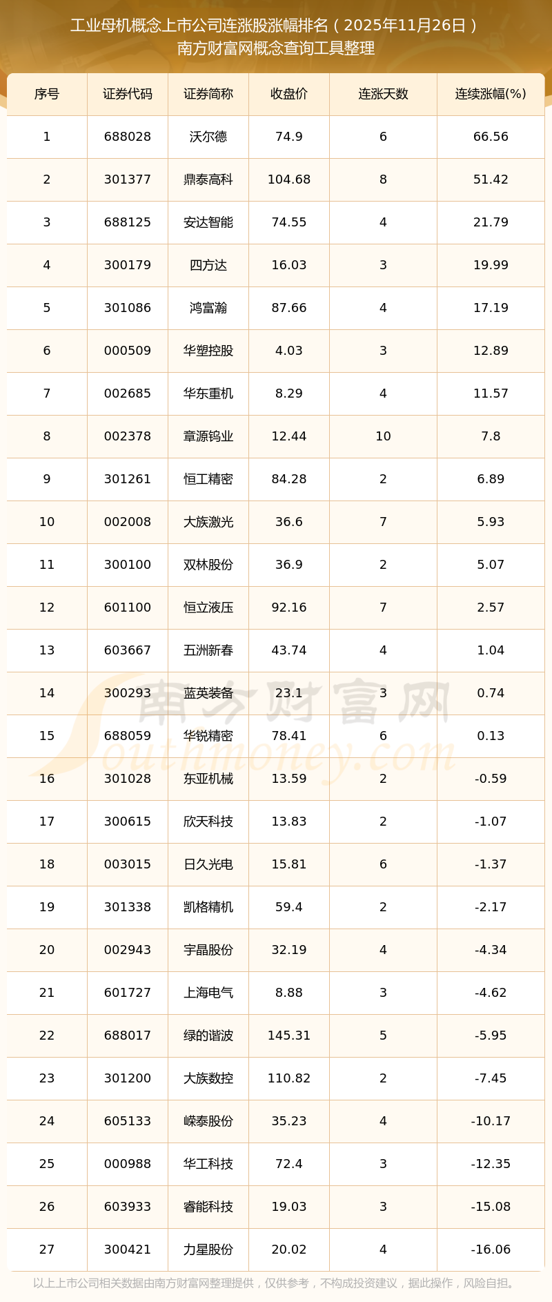 2025年11月26日工業(yè)母機(jī)概念上市公司連漲股漲幅排名