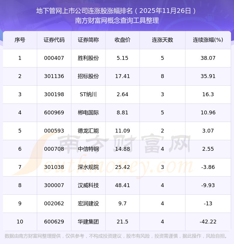 2025年11月26日地下管網(wǎng)上市公司連漲股漲幅排名