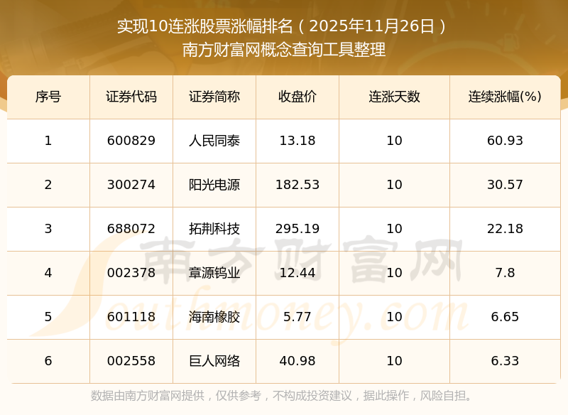 根據(jù)南方財富網(wǎng)概念查詢工具數(shù)據(jù)統(tǒng)計,截止2025年11月26日收盤,共有6只個股實現(xiàn)10天連漲。其中連續(xù)漲幅較大的個股有人民同泰、陽光電源、拓荊科技等,連續(xù)漲幅分別為60.93%、30.57%、22.18%。