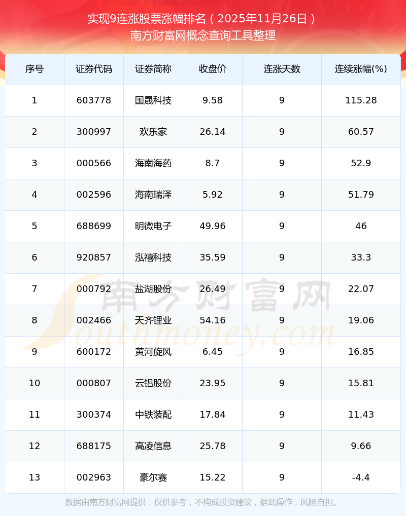 根據(jù)南方財(cái)富網(wǎng)概念查詢工具數(shù)據(jù)統(tǒng)計(jì),截止2025年11月26日收盤,共有13只個(gè)股實(shí)現(xiàn)9天連漲。其中連續(xù)漲幅較大的個(gè)股有國晟科技、歡樂家、海南海藥等,連續(xù)漲幅分別為115.28%、60.57%、52.90%。